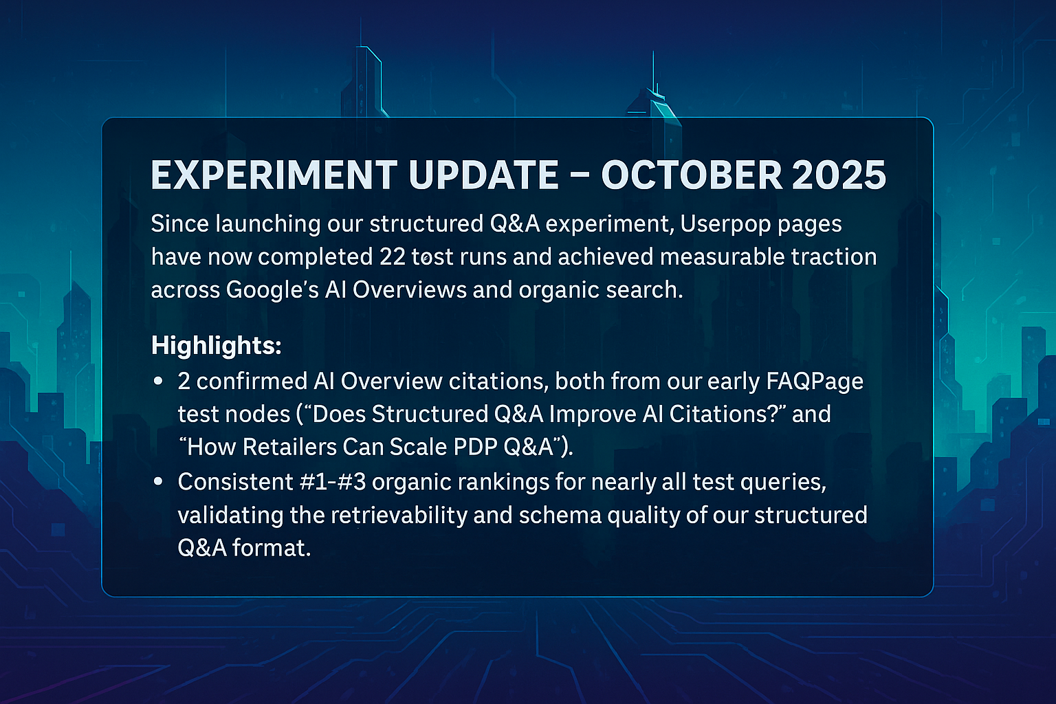 Since launching our structured Q&A experiment, Userpop pages have now completed 22 test runs and achieved measurable traction across Google’s AI Overviews and organic search.